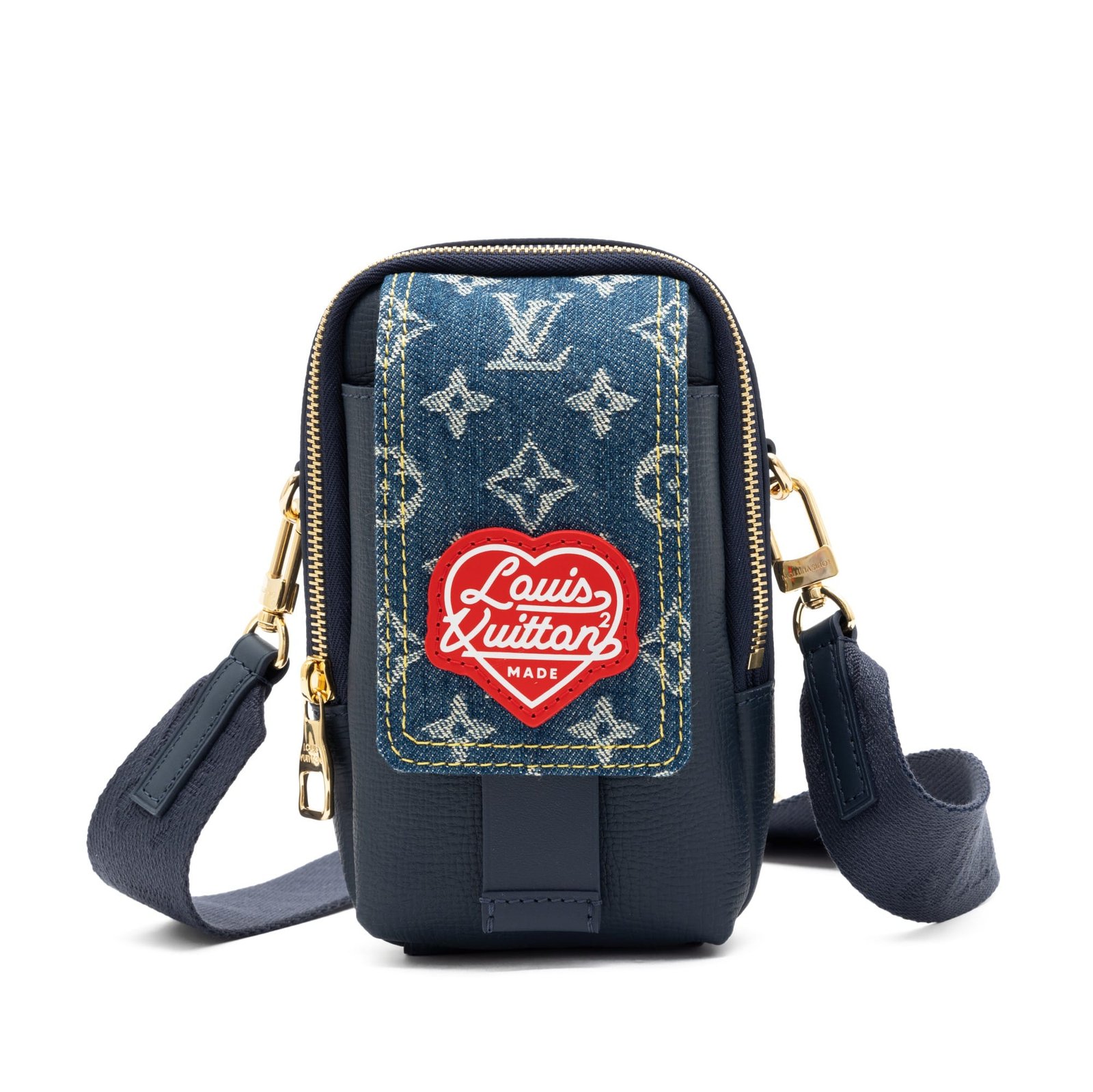 Louis Vuitton Virgil Abloh x NIGO Blue Monogram Denim & Leather Flat Double Phone Pouch Gold Hardware, 2021This bag is lined with blue textile materialThis piece was featured during the 2021 collaboration with Japanese artist NigoIncludes shoulder strap, care card, dustbag and boxThis item is final sale and not eligible for return